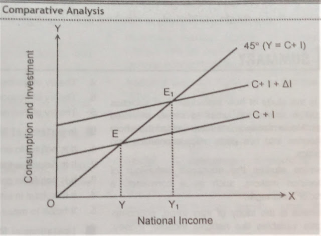 In the figure, E is the equilibrium point where aggregate demand curve (C+I) and aggregate supply curve (45 degree line) are intersected. OY is the equilibrium level of national income. When there is an increase in investment, the aggregate demand curve shifts to C+I+ change in I. consequently, the new equilibrium point is E1 and new equilibrium national income is OY1. The comparative study of two equilibrium points E and E1 is called comparative analysis. But it does not explain the process through which new equilibrium is attained.