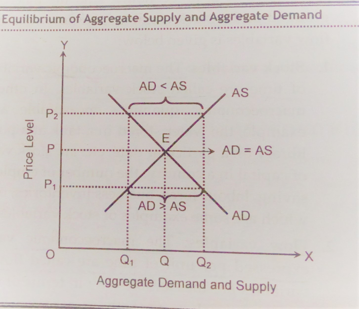 In the figure, x-axis represents aggregate demand and aggregate supply and y-axis represents price level. The downward slopping curve AD is aggregate demand curve. It is slopping downward because of negative relationship between aggregate demand and price level. The upward slopping curve AS represents aggregate supply curve. It is slopping upward because of positive relationship between aggregate supply and price level. These two curves are intersecting each other at point E. the point E is the equilibrium point. Hence, equilibrium price level is OP and equilibrium quantity is OQ. At any price level above or below OP, there is disequilibrium. In these situations, aggregate demand and aggregate supply are not equal. At any price below OP (say OP1) aggregate demand exceeds aggregate supply. On the other hand, at any price level above OP (say OP2), aggregate supply exceeds aggregate demand.