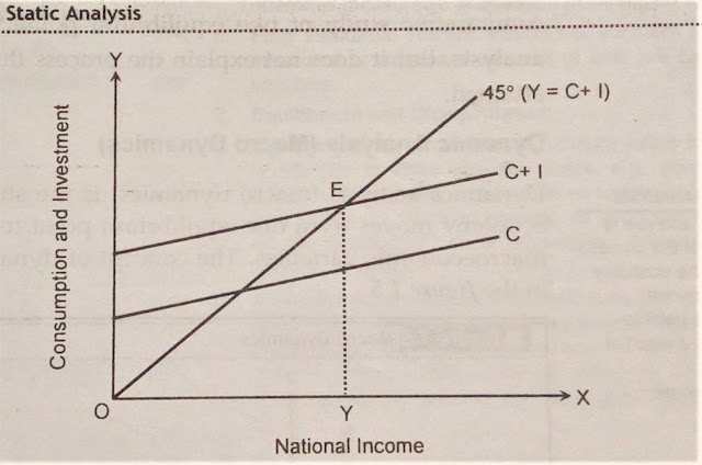 In the figure, aggregate demand curve (C+I) and aggregate supply curve (45 degree line) are intersected at point E. point E is the equilibrium point where the equilibrium level of national income is OY. As aggregate demand and aggregate supply refer to the same point of time, it is static analysis.